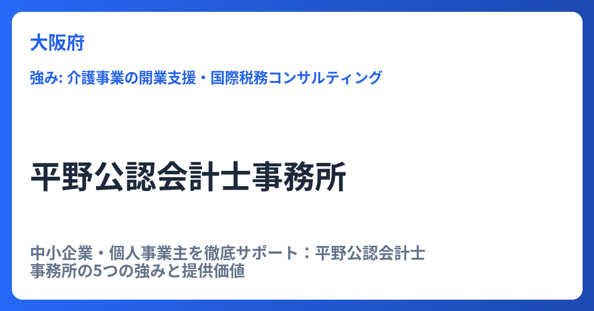 中小企業・個人事業主を徹底サポート:平野公認会計士事務所の5つの強みと提供価値 公認会計士・税理士の専門家サービスは、企業の成長戦略や安定的な経営基盤の構築に不可欠です。中でも、中小企業や個人事業主といった機動性が求められる事業体において... -