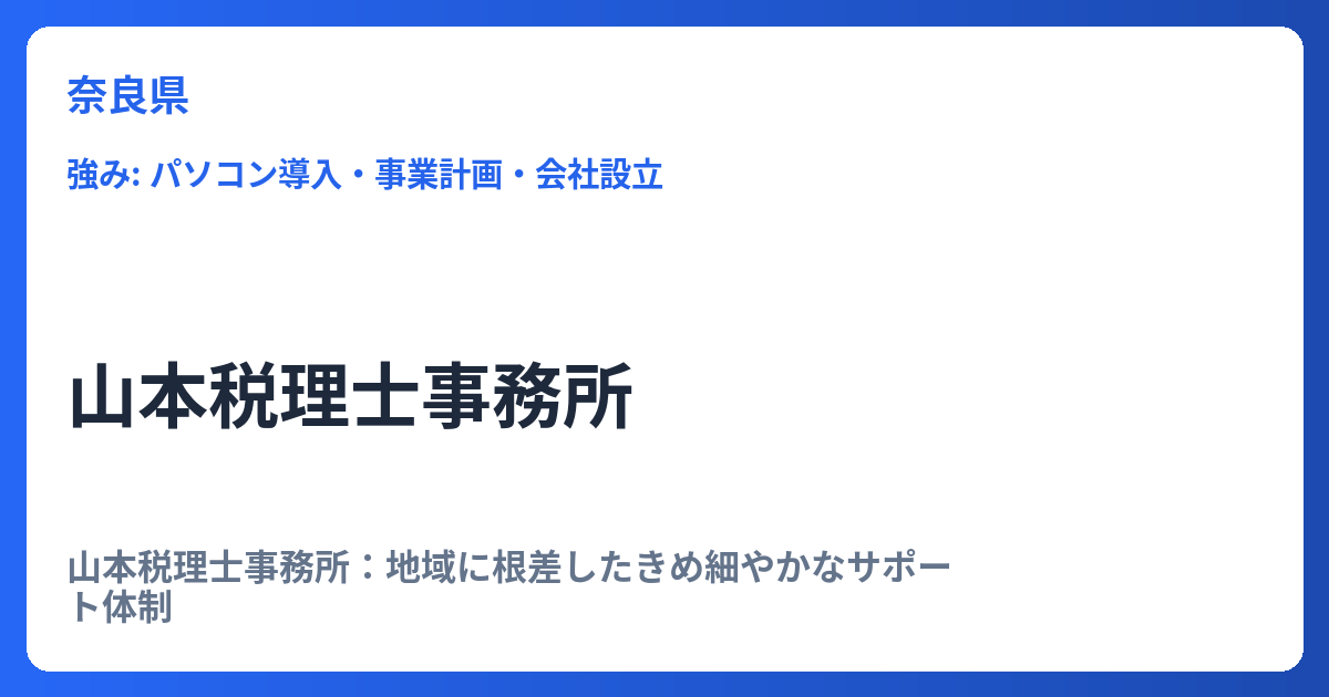 山本税理士事務所:地域に根差したきめ細やかなサポート体制 税理士事務所の選択は、企業の成長や個人の資産形成において極めて重要な経営判断の一つとなります。多くの経営者や個人事業主が求めるのは、単なる税務処理の代行に留まらない、迅速かつ的確な... -