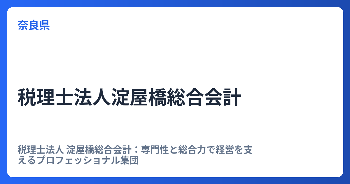 税理士法人 淀屋橋総合会計:専門性と総合力で経営を支えるプロフェッショナル集団 税理士法人 淀屋橋総合会計は、大阪の淀屋橋を拠点とし、奈良にも事務所を構える総合会計事務所です。単なる記帳代行や税務申告に留まらず、企業の成長と課題解決に深くコ... -