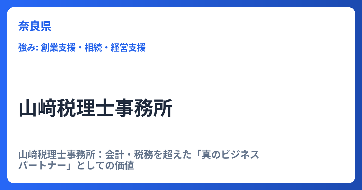 山﨑税理士事務所:会計・税務を超えた「真のビジネスパートナー」としての価値 山﨑税理士事務所は、従来の税理士事務所の枠を超え、顧客企業の成長と課題解決に深くコミットする「真のビジネスパートナー」としての役割を追求しています。単に法令順守に... -