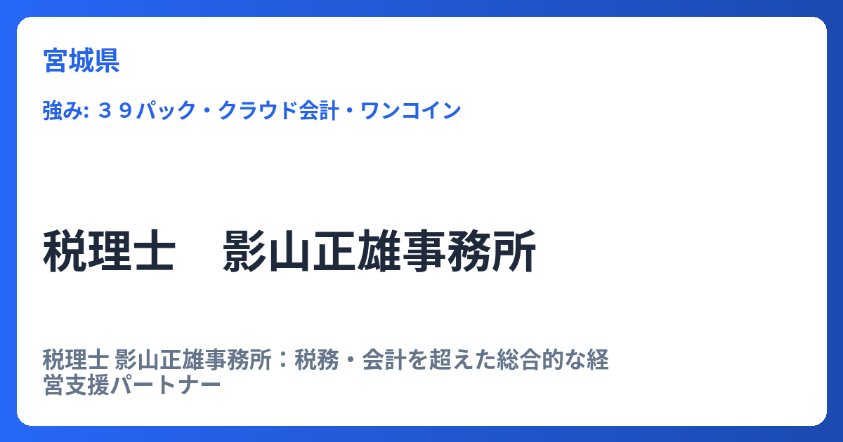 税理士 影山正雄事務所:税務・会計を超えた総合的な経営支援パートナー 現代のビジネス環境において、企業経営は複雑化の一途を辿っています。単なる税務申告や会計処理の正確性だけではなく、経営戦略、資金繰り、そして事業の持続可能性といった多岐に...