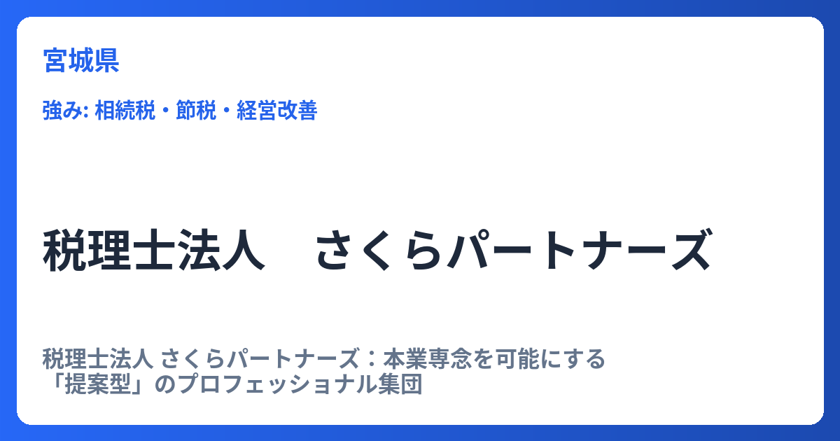 税理士法人 さくらパートナーズ:本業専念を可能にする「提案型」のプロフェッショナル集団 企業の成長を真に支援する税理士事務所とは、単なる税務処理の代行に留まらず、経営の根幹に関わる課題解決と具体的な戦略提案を行うパートナーであるべきです。... -