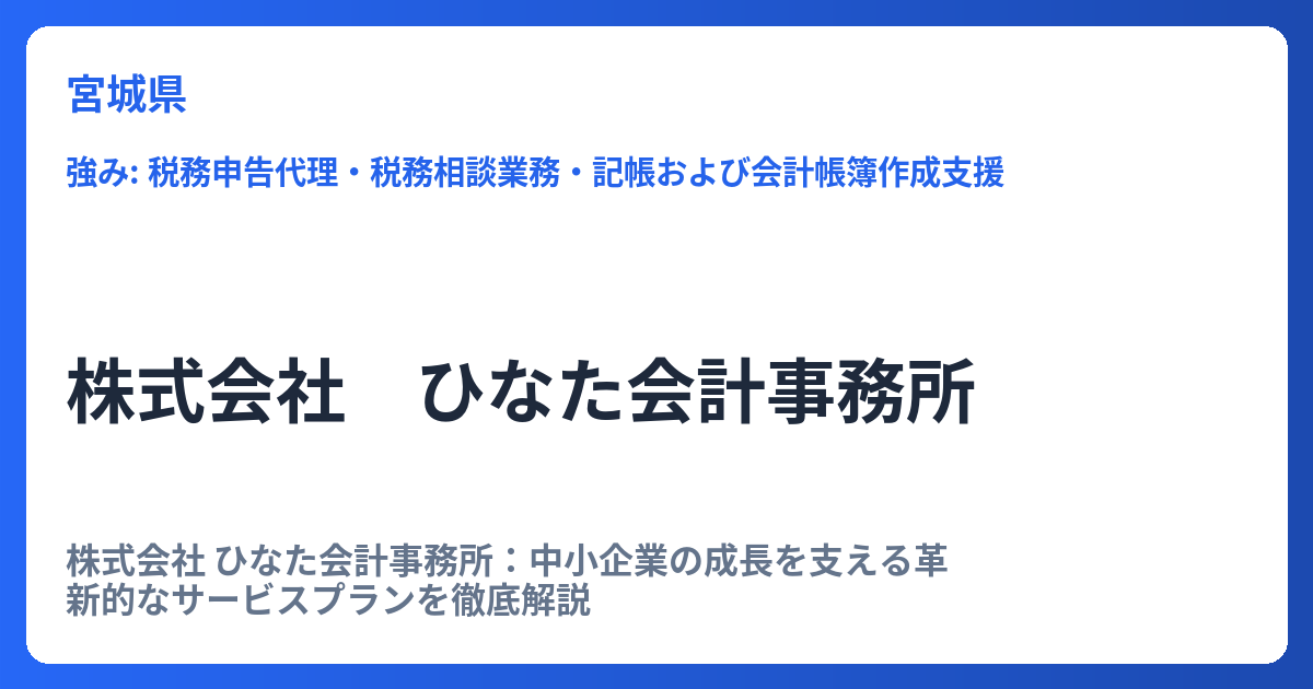 株式会社 ひなた会計事務所:中小企業の成長を支える革新的なサービスプランを徹底解説 株式会社ひなた会計事務所は、企業の成長ステージやニーズに合わせた柔軟かつ低価格な顧問サービスを提供している会計事務所です。特に、その設立経緯や提供するサー... -