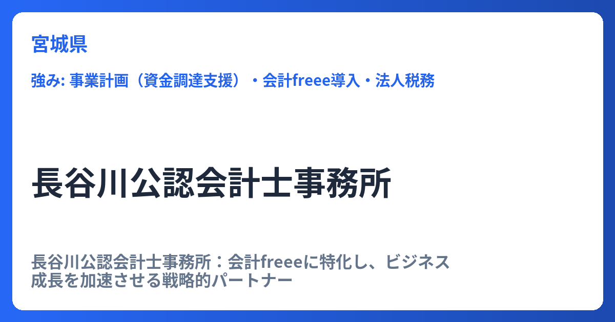 長谷川公認会計士事務所:会計freeeに特化し、ビジネス成長を加速させる戦略的パートナー 長谷川公認会計士事務所は、単なる税務・会計処理の代行業者ではなく、企業の成長を根幹から支える戦略的ビジネスパートナーです。特に、クラウド会計ソフトの代表... -