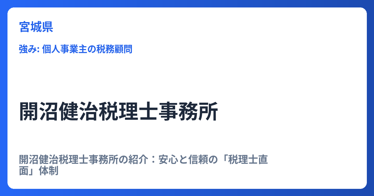 開沼健治税理士事務所の紹介:安心と信頼の「税理士直面」体制 税務顧問契約を結ぶ際、顧客が最も重視するのは、専門家である税理士本人がどれだけ深く関与してくれるかという点です。特に近年、税理士事務所の規模が拡大するにつれて、契約の窓口は税理士... -