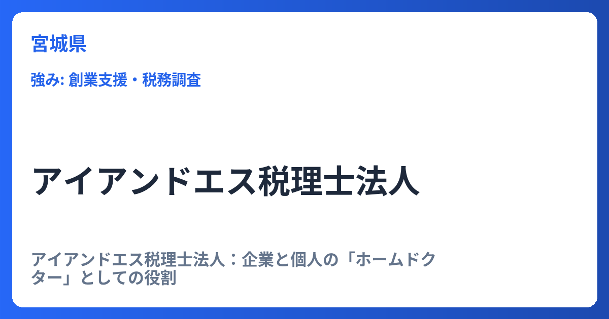 アイアンドエス税理士法人:企業と個人の「ホームドクター」としての役割 現代のビジネス環境において、税務・会計は単なる義務ではなく、企業の成長と個人の資産形成を左右する重要な戦略領域となっています。そのような複雑な時代背景の中で、アイアンド... -