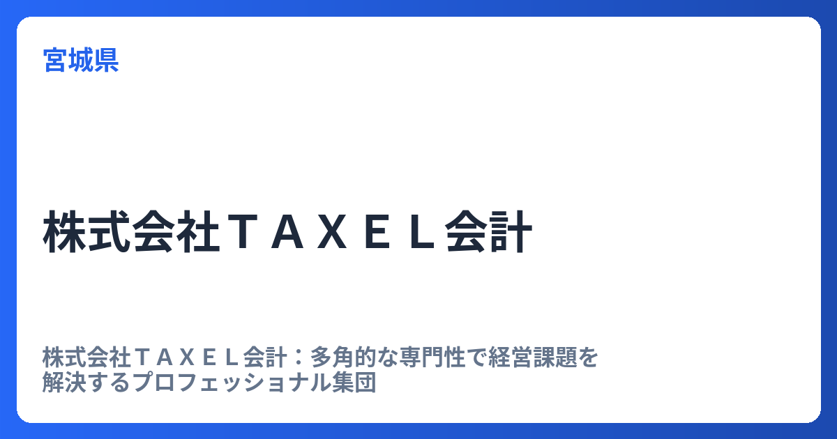 株式会社TAXEL会計:多角的な専門性で経営課題を解決するプロフェッショナル集団 現代の企業経営は、会計・税務の知識に加え、金融、法務、人事など多岐にわたる専門知識を必要とします。特に中小企業やベンチャー企業にとって、これらの課題をすべて... -