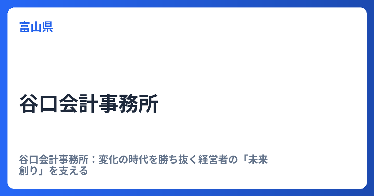 谷口会計事務所:変化の時代を勝ち抜く経営者の「未来創り」を支える 激変するビジネス環境において、企業が持続的に成長を遂げるためには、経営者自身が明確なビジョンを持ち、変化を恐れず挑戦し続けることが不可欠です。谷口会計事務所は、「人の未来は...