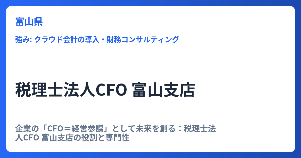 企業の「CFO=経営参謀」として未来を創る:税理士法人CFO 富山支店の役割と専門性 現代の企業経営において、税務・会計は単なる過去の記録や義務の履行に留まりません。企業の持続的な成長を実現するためには、財務の側面から経営戦略を立案し、重要な意... -