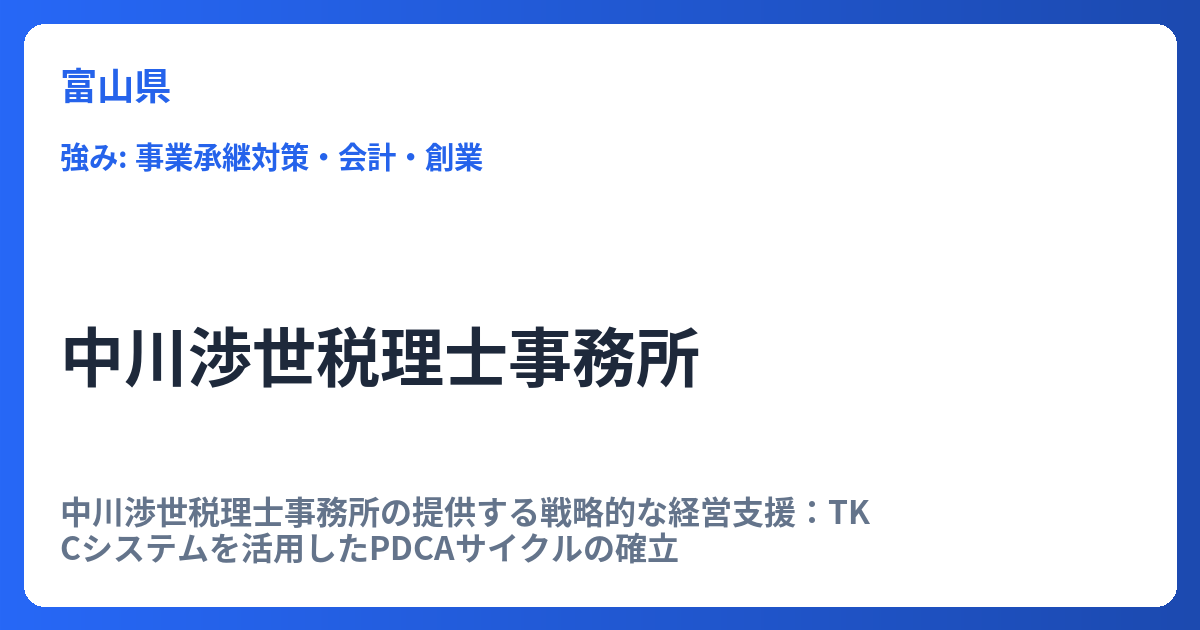 中川渉世税理士事務所の提供する戦略的な経営支援:TKCシステムを活用したPDCAサイクルの確立 中川渉世税理士事務所は、単なる税務申告の代行に留まらず、中小企業の経営体質強化と持続的な成長を強力にサポートする専門事務所です。特に、全国の会計事務... -