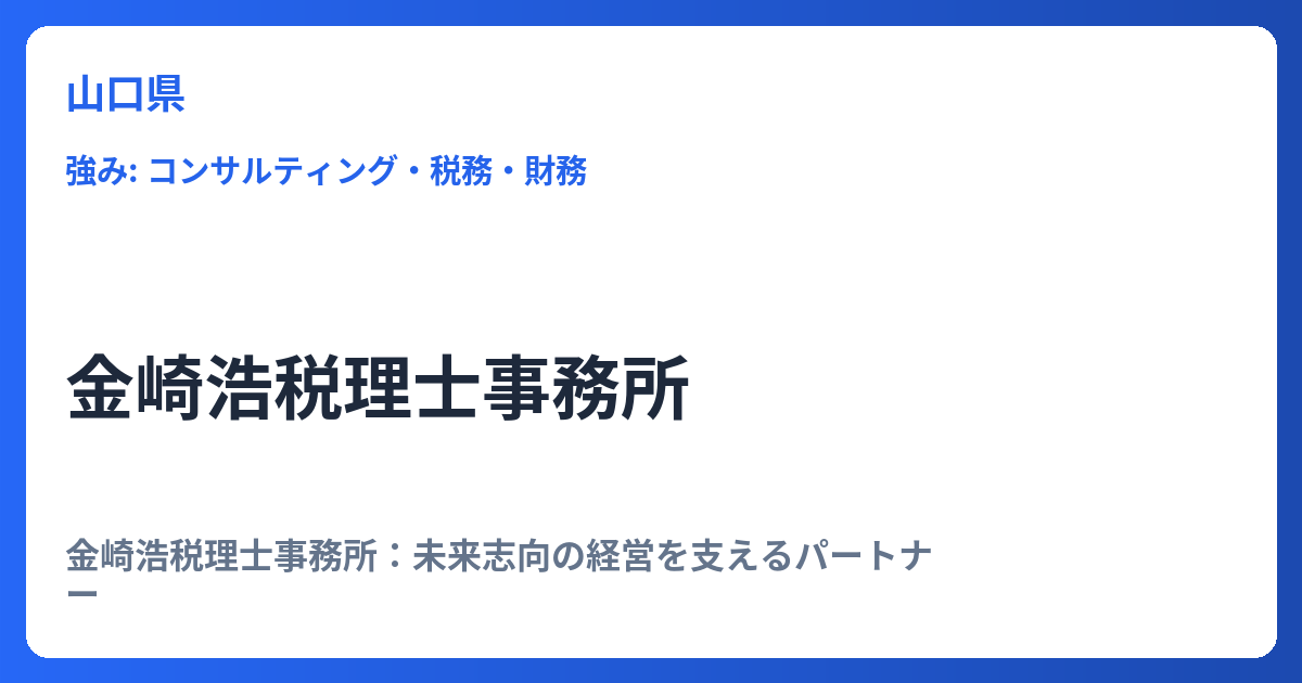金崎浩税理士事務所:未来志向の経営を支えるパートナー 金崎浩税理士事務所は、従来の税理士事務所の枠を超え、企業の持続的な成長を強力にサポートする総合的な経営パートナーとしての役割を果たしています。単に過去の取引を整理し税務申告を代行するだ...