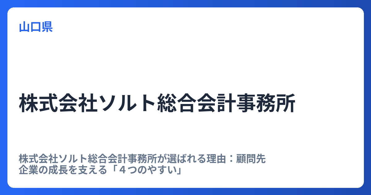 株式会社ソルト総合会計事務所が選ばれる理由:顧問先企業の成長を支える「4つのやすい」 企業の経営を取り巻く環境は常に変化しており、税務や会計はもちろん、経営戦略全体に対する専門的なサポートの必要性が高まっています。その中で、単なる数字の処... -