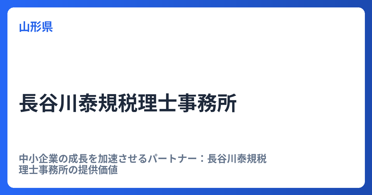 中小企業の成長を加速させるパートナー:長谷川泰規税理士事務所の提供価値 中小企業が直面する経営課題は多岐にわたり、税務・会計の専門知識だけでなく、事業全体の未来を見据えた戦略的なサポートが不可欠です。長谷川泰規税理士事務所は、「中小企業を...