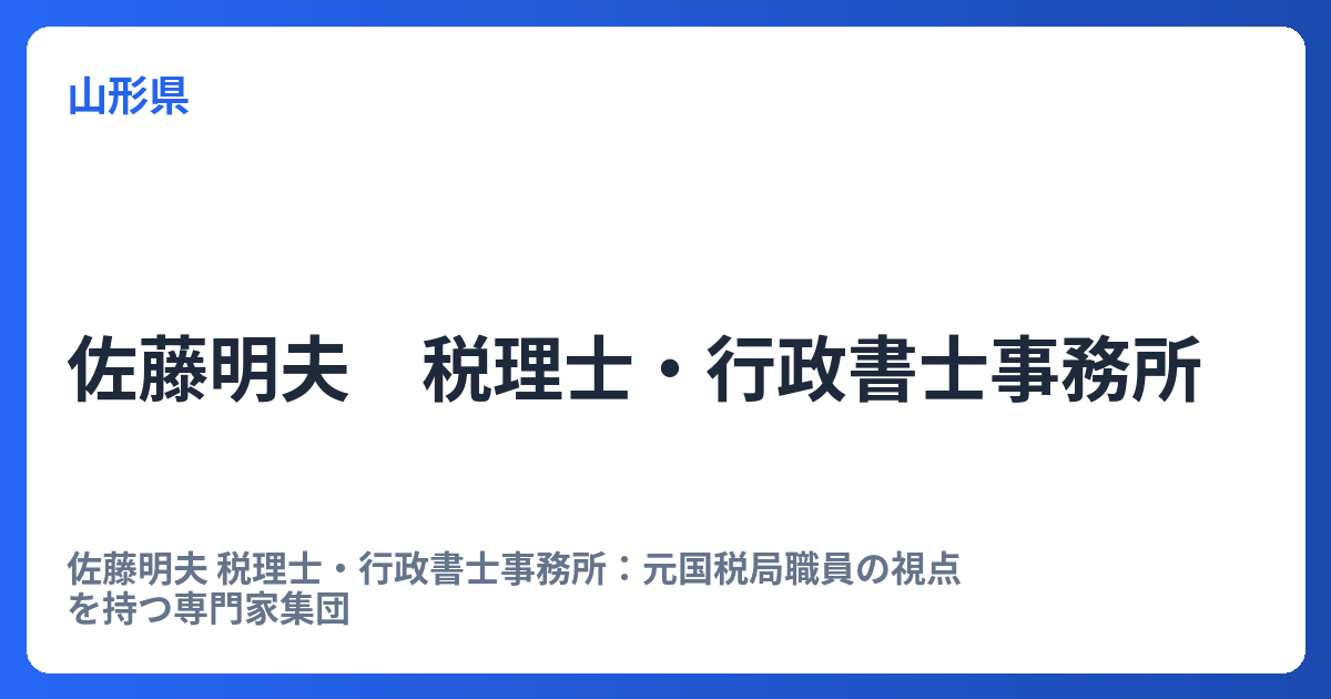 佐藤明夫 税理士・行政書士事務所:元国税局職員の視点を持つ専門家集団 佐藤明夫 税理士・行政書士事務所は、山形県寒河江市に拠点を置く、税理士と行政書士のダブルライセンスを持つ専門家事務所です。代表者は元国税局職員としての豊富な実務経験を有し... -