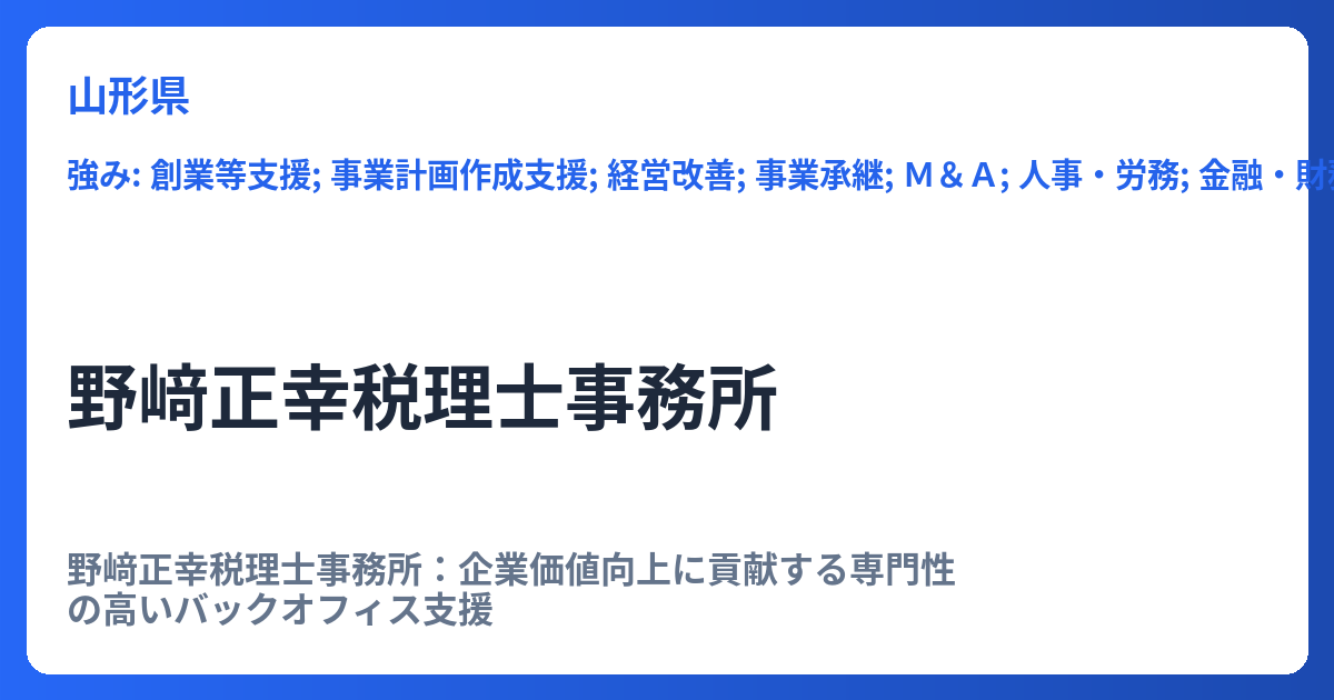 野﨑正幸税理士事務所:企業価値向上に貢献する専門性の高いバックオフィス支援 現代のビジネス環境において、企業が持続的な成長を遂げるためには、中核となる事業(コアビジネス)への集中が不可欠です。しかし、経理・税務、給与計算、社会保険といった... -