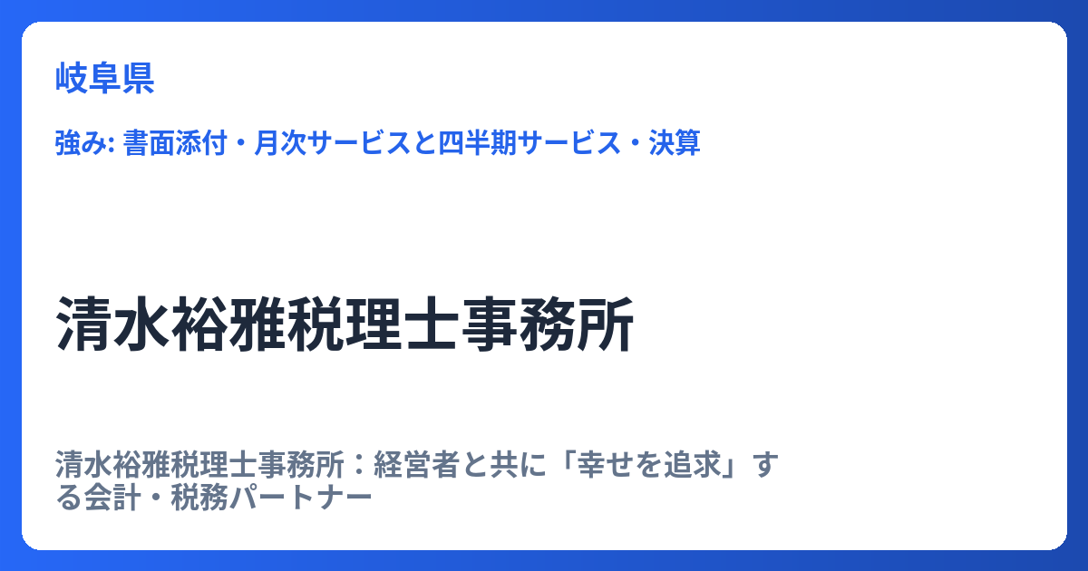清水裕雅税理士事務所:経営者と共に「幸せを追求」する会計・税務パートナー 清水裕雅税理士事務所は、単なる会計処理や税務申告の代行に留まらず、顧問先企業、そしてその企業を取り巻くステークホルダー全体の「幸せを追求」することを理念に掲げる専門...