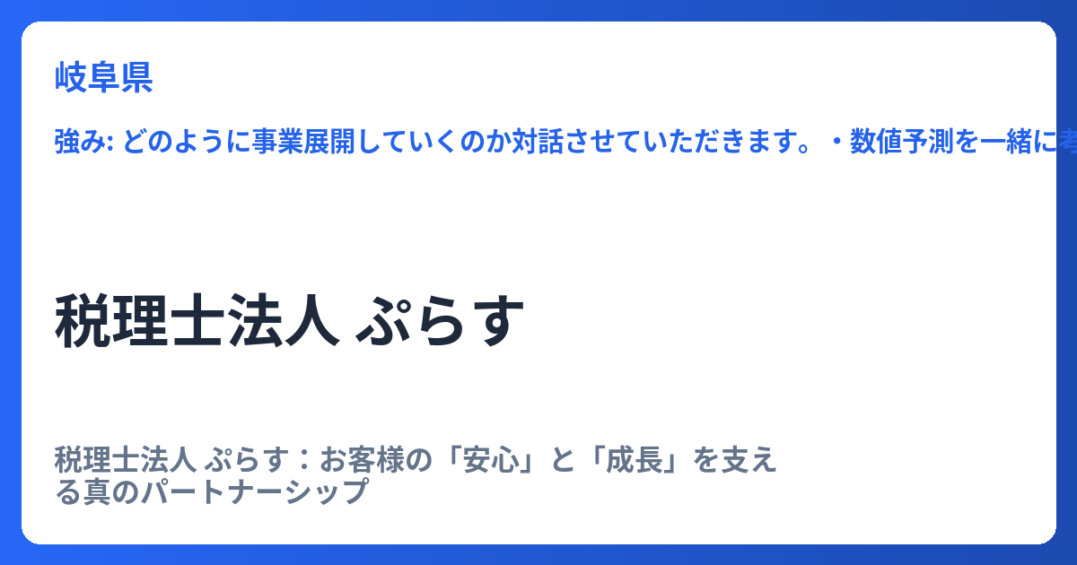 税理士法人 ぷらす:お客様の「安心」と「成長」を支える真のパートナーシップ 税理士法人 ぷらすは、単なる税務・会計処理の代行業者に留まらず、顧客一人ひとりのビジネスと人生に深く寄り添う真のパートナーとして、専門性の高いサービスを提供していま... -