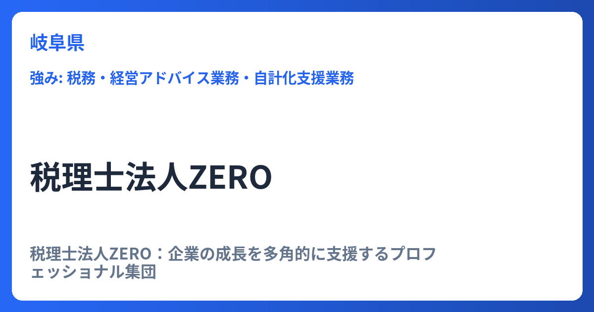 税理士法人ZERO:企業の成長を多角的に支援するプロフェッショナル集団 税理士法人ZEROは、従来の税務申告業務に留まらず、企業の持続的な成長を支援するための多岐にわたる経営サポートを提供している専門家集団です。単なる会計処理の代行ではなく、経営... -