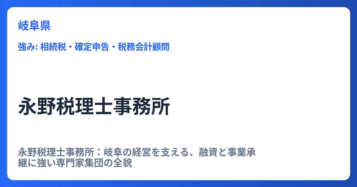 永野税理士事務所:岐阜の経営を支える、融資と事業承継に強い専門家集団の全貌 岐阜県に根ざし、長きにわたり地域の中小企業の成長を支え続けているのが、永野税理士事務所です。単なる記帳代行や税務申告に留まらず、金融機関との連携、事業承継、特定の... -