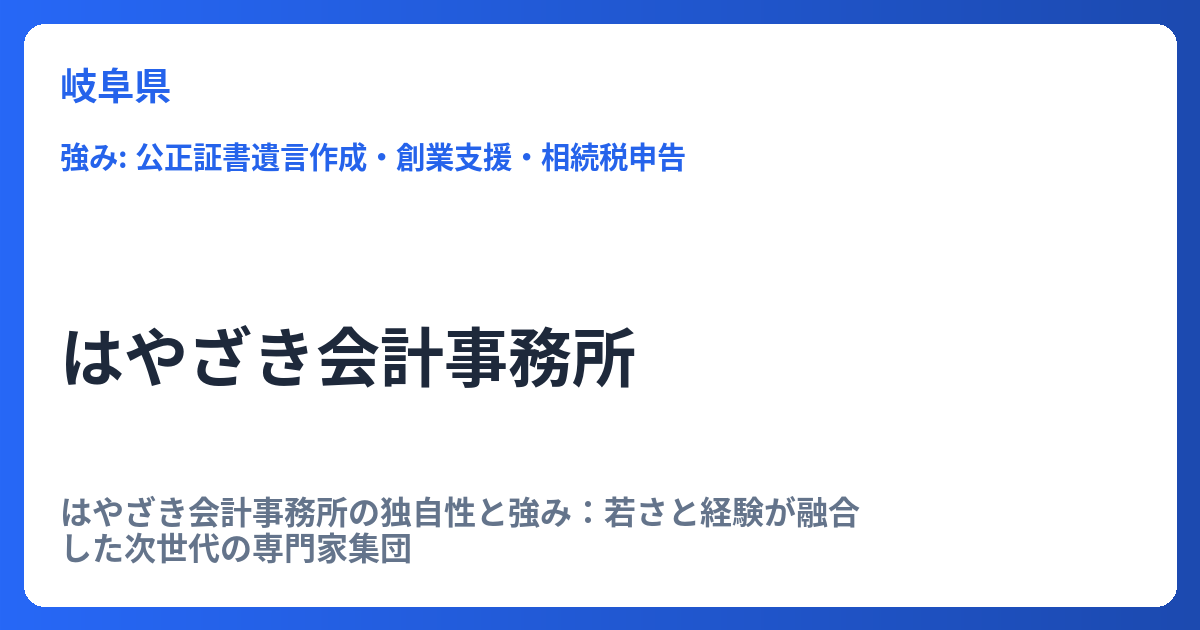 はやざき会計事務所の独自性と強み:若さと経験が融合した次世代の専門家集団 税理士選びは、企業の成長や個人の資産形成において極めて重要な経営判断の一つです。特に、変化の激しい現代において、フットワークの軽さと専門性の深さを兼ね備えたパートナ... -