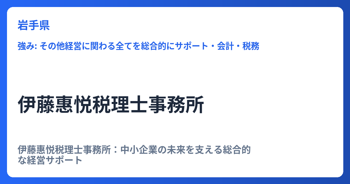 伊藤惠悦税理士事務所:中小企業の未来を支える総合的な経営サポート 伊藤惠悦税理士事務所は、単なる税務・会計の枠を超え、企業の持続的な成長を支援する総合的な経営パートナーとして、多岐にわたるサポートを提供しています。特に、変化の激しい現代の...