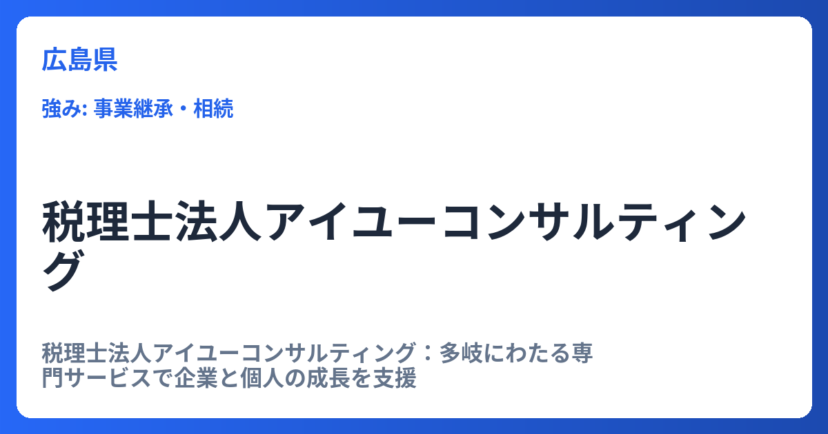 税理士法人アイユーコンサルティング:多岐にわたる専門サービスで企業と個人の成長を支援 税理士法人アイユーコンサルティングは、単なる税務申告代行に留まらず、企業の成長戦略から個人の資産承継に至るまで、多角的なコンサルティングサービスを提供す... -