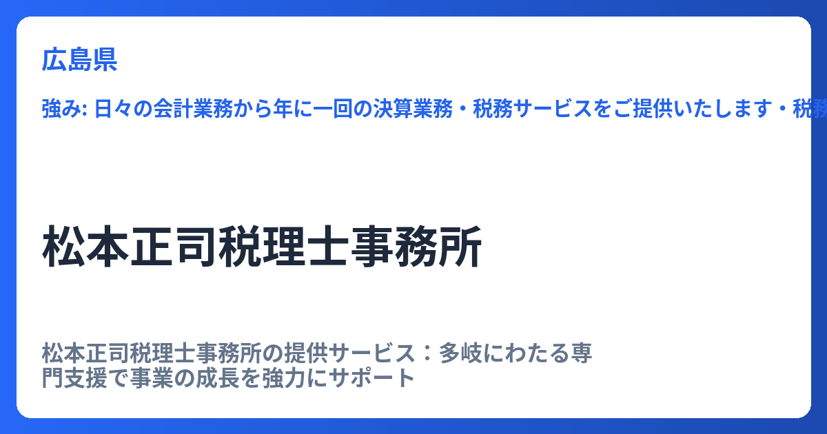 松本正司税理士事務所の提供サービス:多岐にわたる専門支援で事業の成長を強力にサポート 松本正司税理士事務所は、単なる税務申告の代行に留まらず、企業の成長ステージに応じた多角的かつ専門的なサポートを提供している会計事務所です。特に、ITを活用... -