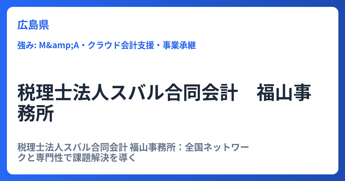 税理士法人スバル合同会計 福山事務所:全国ネットワークと専門性で課題解決を導く 税理士法人スバル合同会計 福山事務所は、「お客さまの問題を解決する専門家」をミッションに掲げ、地域社会に根ざしながら、全国規模のネットワークと高度な専門性を融合... -