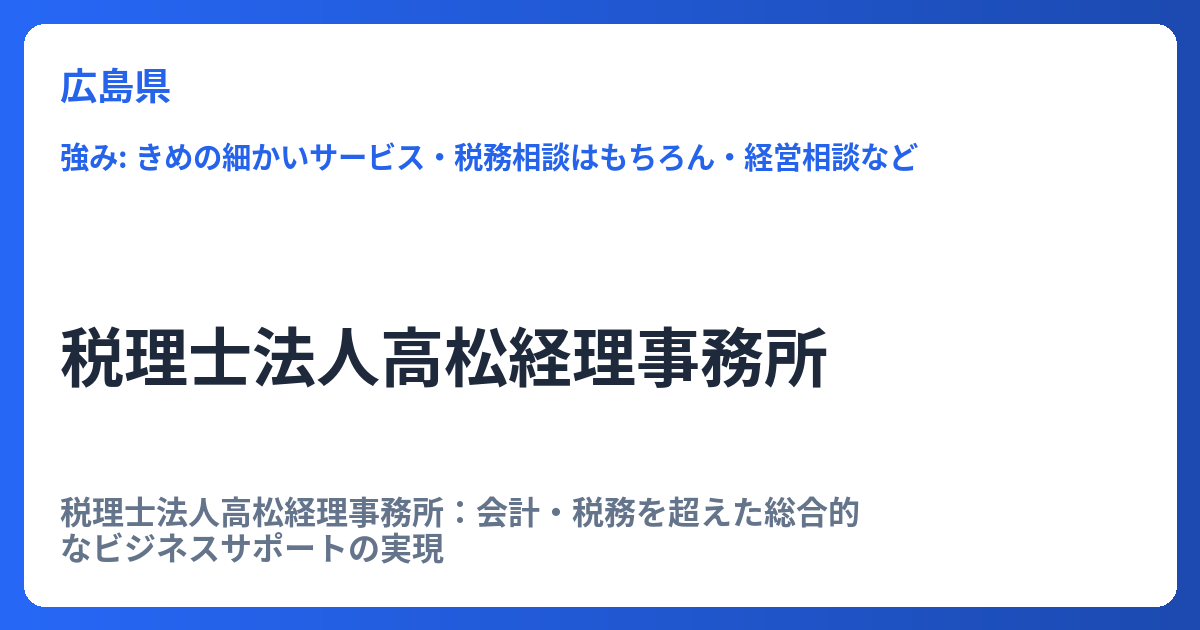税理士法人高松経理事務所:会計・税務を超えた総合的なビジネスサポートの実現 現代のビジネス環境は複雑化しており、企業が持続的な成長を遂げるためには、単なる記帳代行や税務申告に留まらない、より戦略的な専門家の支援が不可欠です。そのような時代... -