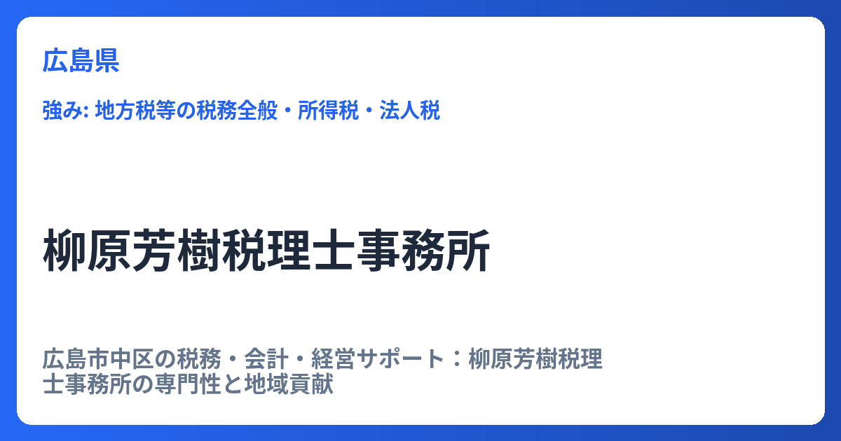 広島市中区の税務・会計・経営サポート:柳原芳樹税理士事務所の専門性と地域貢献 地域に根差した40年近い実績と幅広い専門領域 広島市中区に拠点を置く柳原芳樹税理士事務所は、長きにわたり地元広島の企業や個人事業主、そして一般の方々の税務・会計ニ... -