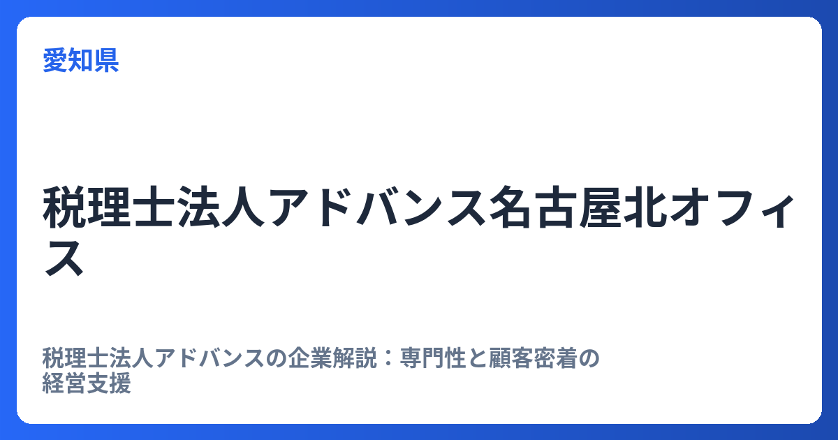 税理士法人アドバンスの企業解説:専門性と顧客密着の経営支援 税理士法人アドバンスは、愛知県岡崎市に本拠を構え、税務会計業務を核として、多岐にわたる経営コンサルティングサービスを提供するプロフェッショナルファームです。同法人は、昭和45年(19... -