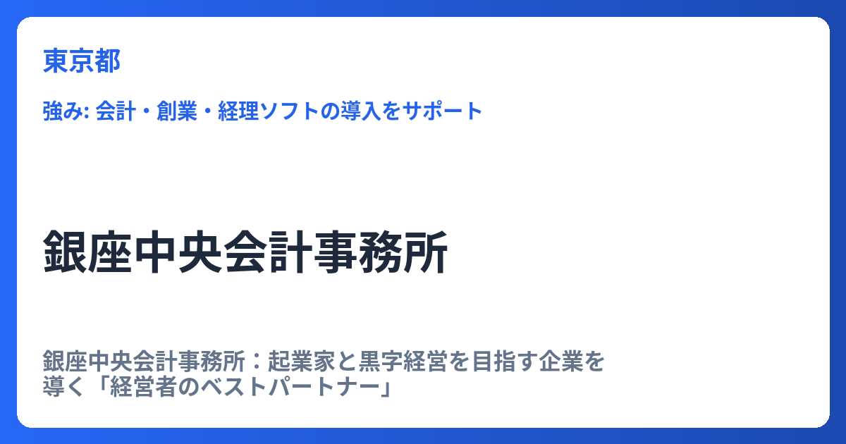 銀座中央会計事務所:起業家と黒字経営を目指す企業を導く「経営者のベストパートナー」 銀座中央会計事務所は、「経営者のベストパートナー」として、企業の成長と安定的な黒字経営を強力にサポートする会計事務所です。特に、これから事業を立ち上げる起... -