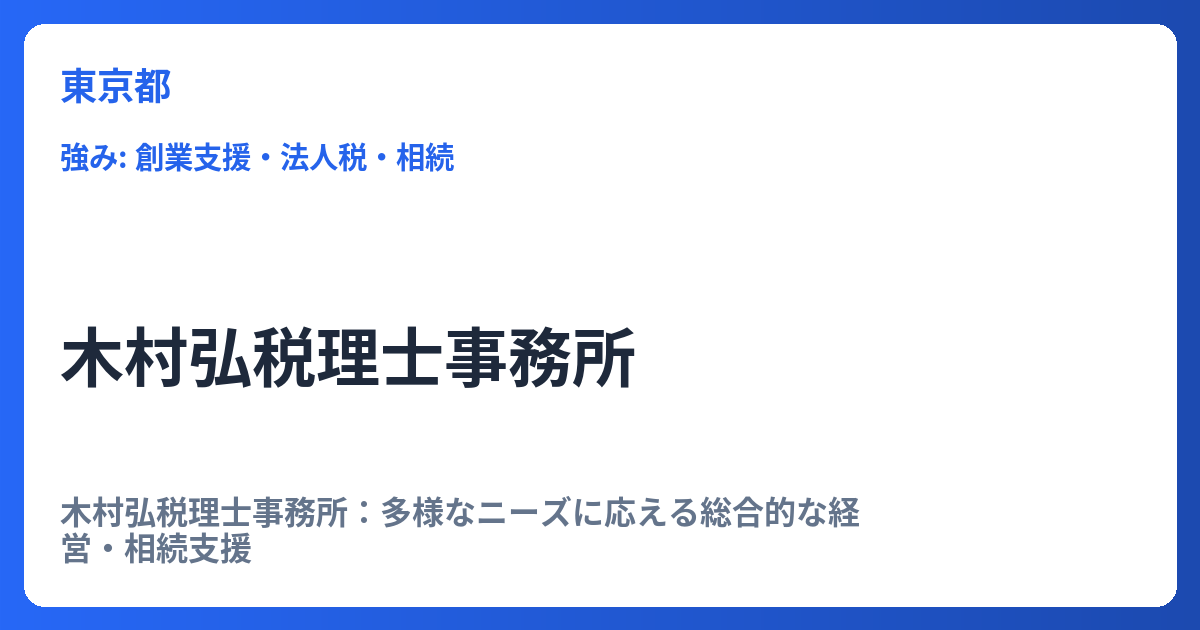 木村弘税理士事務所:多様なニーズに応える総合的な経営・相続支援 現代のビジネス環境は複雑化しており、企業経営者や個人事業主、そして相続を控える方々にとって、専門性の高い税務・財務サポートは不可欠です。そのような多岐にわたる課題に対し、木村... -