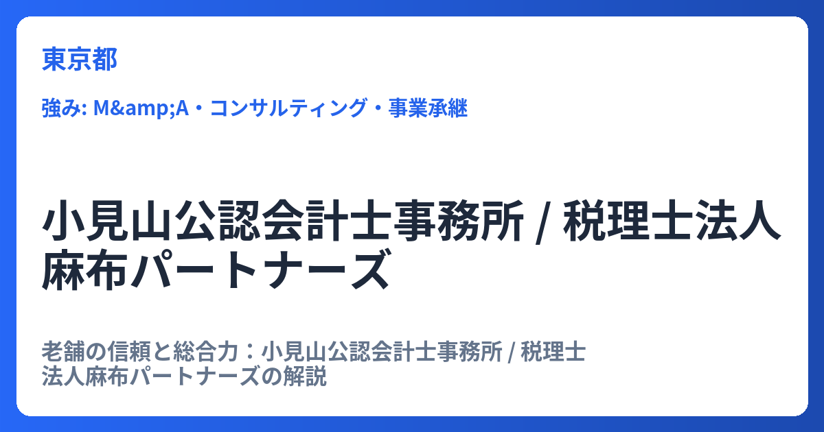 老舗の信頼と総合力:小見山公認会計士事務所 / 税理士法人麻布パートナーズの解説 公認会計士事務所・税理士法人を選ぶ際、クライアントが求めるのは、単なる税務会計処理の正確性だけではありません。時代とともに複雑化する経営課題に対し、多角的な視... -