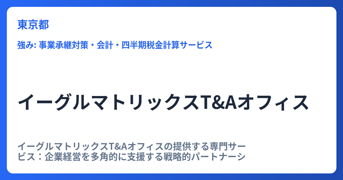 イーグルマトリックスT&Aオフィスの提供する専門サービス:企業経営を多角的に支援する戦略的パートナーシップ イーグルマトリックスT&Aオフィスは、企業の複雑な経営課題に対し、税務、会計、そしてコンサルティングの側面から包括的なソリューシ... -