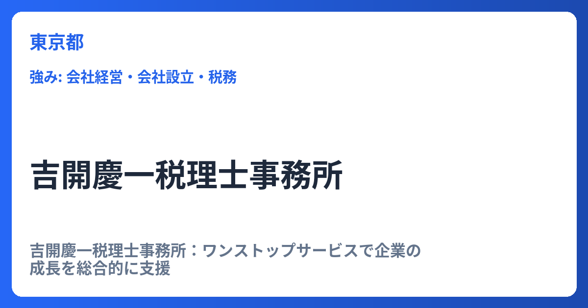 吉開慶一税理士事務所:ワンストップサービスで企業の成長を総合的に支援 経営を取り巻く課題は多岐にわたり、税務、労務、会計といった専門分野が複雑に絡み合っています。中小企業やスタートアップが本業に集中し、持続的な成長を実現するためには、これ... -