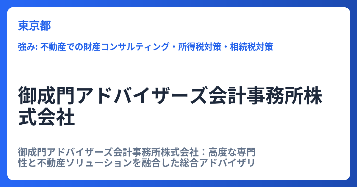 御成門アドバイザーズ会計事務所株式会社:高度な専門性と不動産ソリューションを融合した総合アドバイザリー 御成門アドバイザーズ会計事務所株式会社は、単なる税務会計の枠を超え、代表者の深い知見と実務経験に基づいた多角的なサービスを提供する会計... -