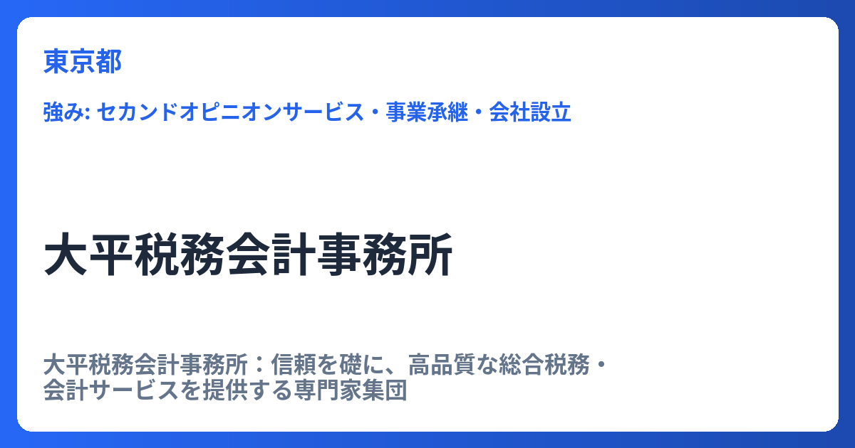 大平税務会計事務所:信頼を礎に、高品質な総合税務・会計サービスを提供する専門家集団 現代のビジネス環境は複雑化しており、税務・会計に関する課題も多様化しています。このような時代において、企業や個人事業主が持続的な成長を遂げるためには、深い... -