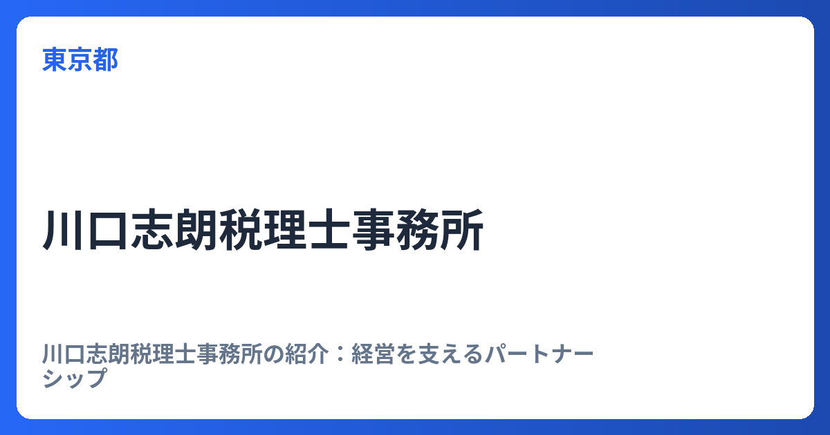 川口志朗税理士事務所の紹介:経営を支えるパートナーシップ 川口志朗税理士事務所は、単なる税務・会計の代行業者に留まらず、顧客の持続的な成長と発展をサポートする真の経営パートナーを目指しています。現代のビジネス環境は変化が激しく、経営者は複... -