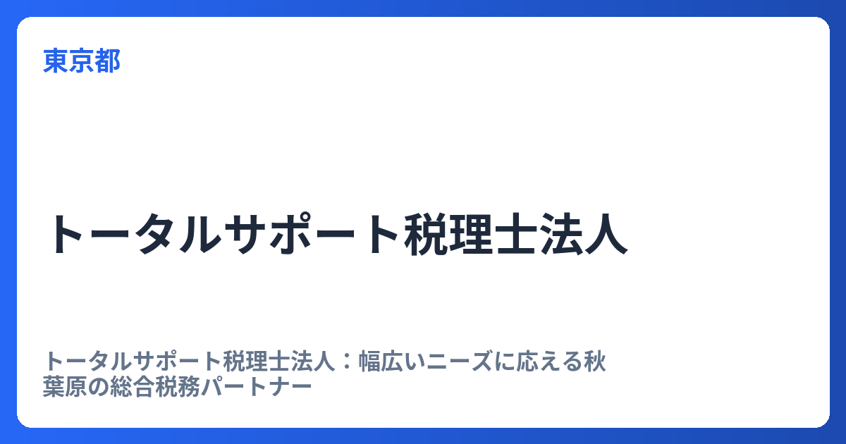 トータルサポート税理士法人:幅広いニーズに応える秋葉原の総合税務パートナー 税理士選びは、事業経営や個人の資産形成において極めて重要な決断です。世の中には数多くの税理士事務所が存在しますが、それぞれが「不動産関連の悩み相談に強い」「相続に... -