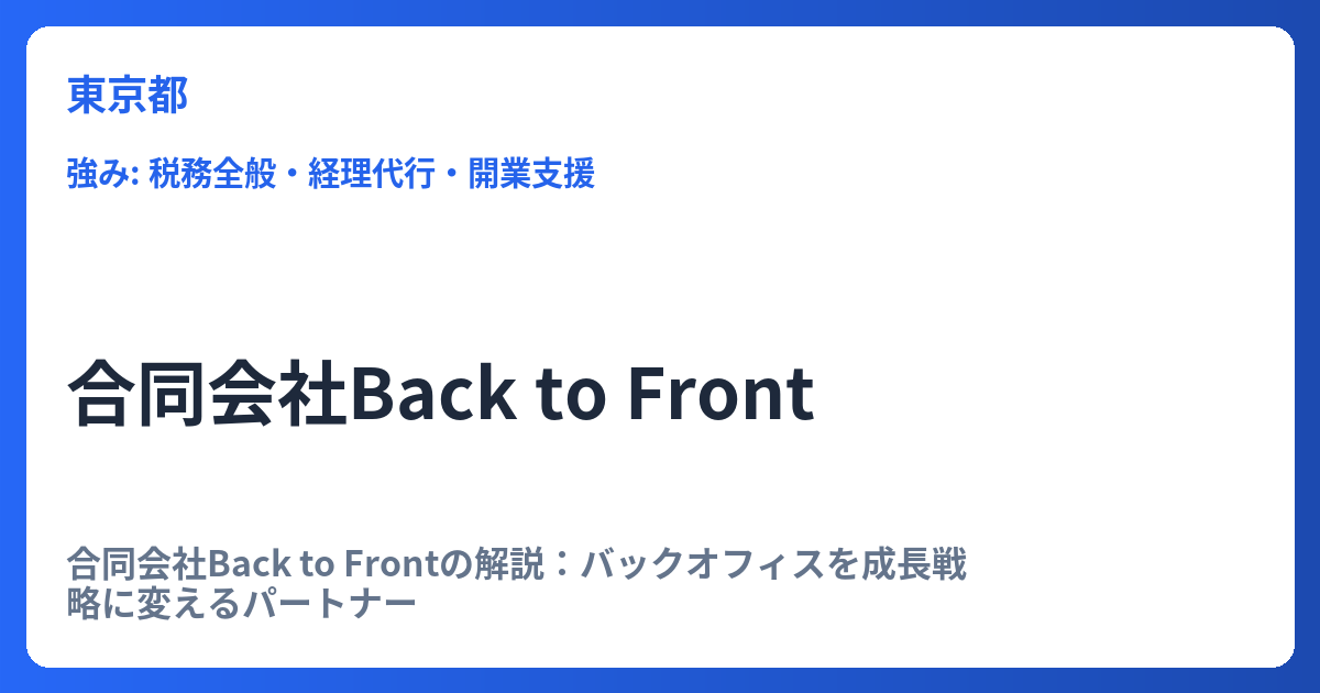 合同会社Back to Frontの解説:バックオフィスを成長戦略に変えるパートナー ビジネスの成長フェーズにおいて、コア業務への集中は企業の競争力を高める上で不可欠です。しかし、経理・総務といったバックオフィス業務は、その煩雑さから経営者の時間とリ... -
