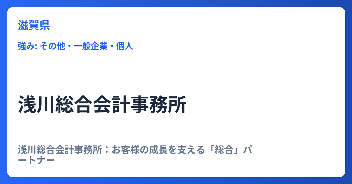 浅川総合会計事務所:お客様の成長を支える「総合」パートナー 現代のビジネス環境は複雑化しており、企業経営には税務、会計だけでなく、労務、法務、さらには事業承継やM&Aといった多岐にわたる専門知識が求められます。このような背景の中、中小企...