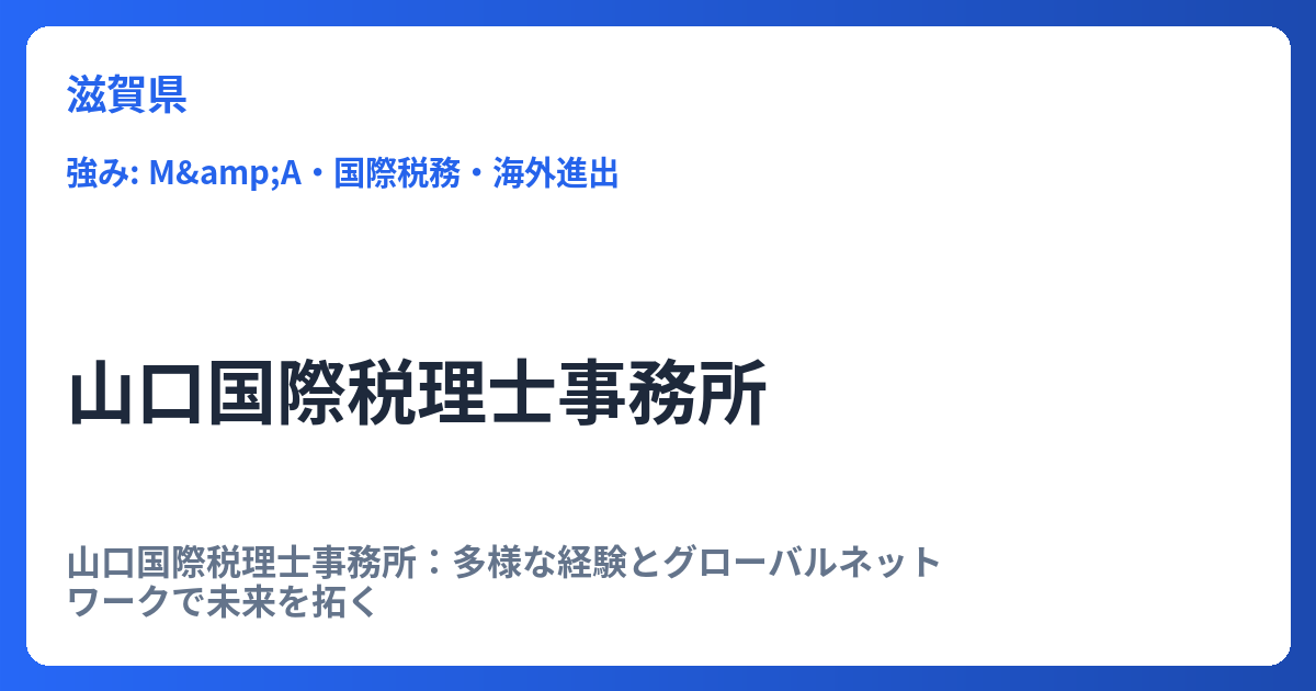 山口国際税理士事務所は、「お客様の過去、現在、未来に対して最適なサービスを提供します!」を理念に掲げ、国内外の幅広い経験を背景に質の高い税務・会計サービスを提供する専門家集団です。 山口国際税理士事務所:多様な経験とグローバルネットワーク... -