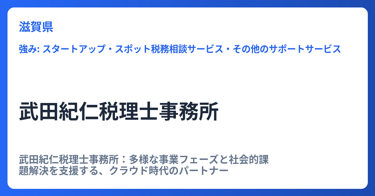 武田紀仁税理士事務所:多様な事業フェーズと社会的課題解決を支援する、クラウド時代のパートナー 武田紀仁税理士事務所は、単なる税務申告の代行に留まらず、スモールビジネス、個人事業主、スタートアップ、そしてNPO法人まで、多岐にわたるクライアン... -
