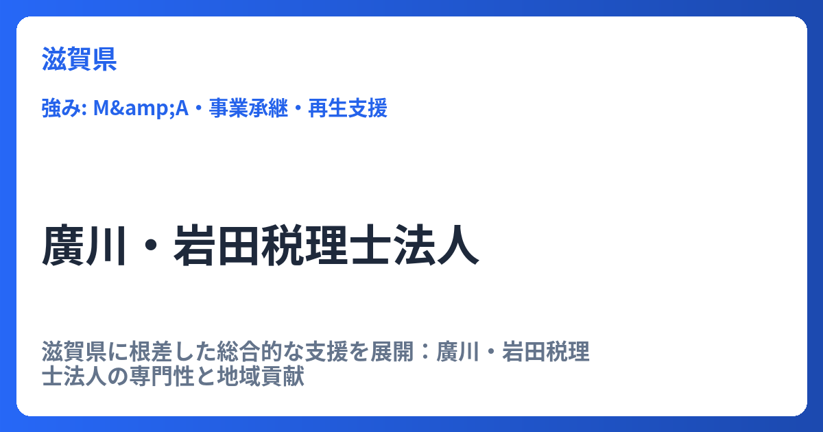滋賀県に根差した総合的な支援を展開:廣川・岩田税理士法人の専門性と地域貢献 滋賀県内で事業を営む企業や個人の皆様にとって、税務・会計の専門家選びは経営の安定と発展に直結する重要な判断です。特に地域に深く根差し、その特性を理解したサポートを... -