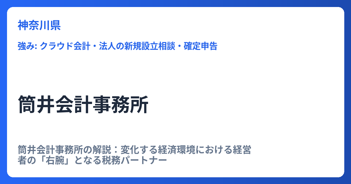 筒井会計事務所の解説:変化する経済環境における経営者の「右腕」となる税務パートナー 現代の経済環境は絶えず変化しており、それに伴い税制や関連法規も複雑化の一途を辿っています。このような状況下で企業が持続的に成長し、利益を最大化するためには...