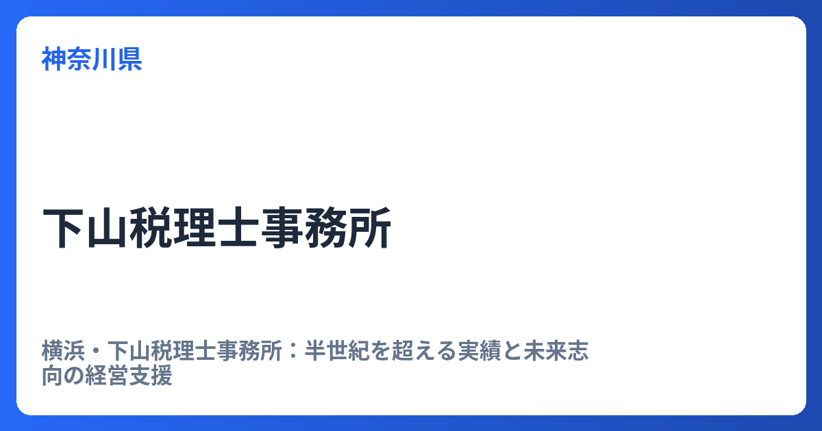 横浜・下山税理士事務所:半世紀を超える実績と未来志向の経営支援 税理士事務所の選定において、最も重要視される要素の一つが「実績」と「信頼性」です。神奈川県横浜市に拠点を置く下山税理士事務所は、この両面で特筆すべき特徴を持っています。昭和36... -