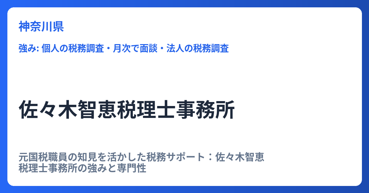 元国税職員の知見を活かした税務サポート:佐々木智恵税理士事務所の強みと専門性 税理士事務所の選択において、その専門性やバックグラウンドは極めて重要な判断材料となります。特に税務調査への対応は、事業運営における重大なリスクの一つです。佐々木... -