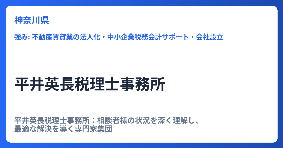 平井英長税理士事務所:相談者様の状況を深く理解し、最適な解決を導く専門家集団 平井英長税理士事務所は、単なる税務申告の代行に留まらず、相談者様一人ひとりの複雑な状況を時間をかけて丁寧にヒアリングし、その上で最善の解決方法を導き出すことを理... -