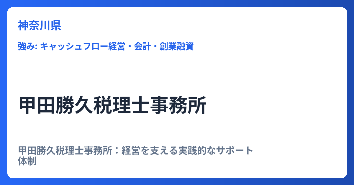 甲田勝久税理士事務所:経営を支える実践的なサポート体制 甲田勝久税理士事務所は、単なる税務申告の代行に留まらず、企業の安定的な成長と効率的な経営を多角的に支援するサービスを提供しています。特に、変化の激しい現代ビジネスにおいて不可欠な資金... -